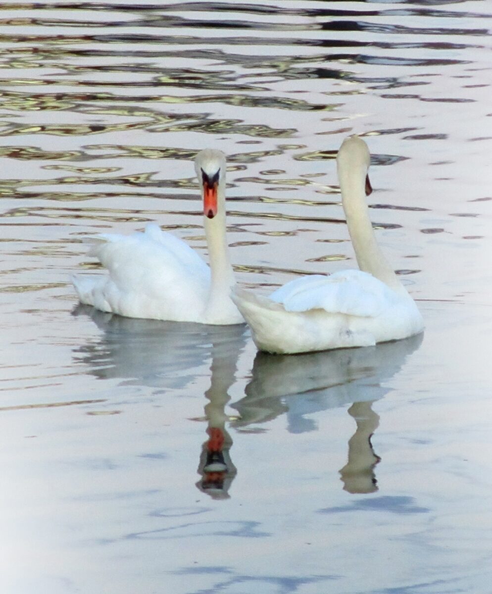 Kuva on otettu Lahden Vesijärvellä. Joutsenpariskunta ui rauhallisesti yhdessä kauniissa kesäillassa.