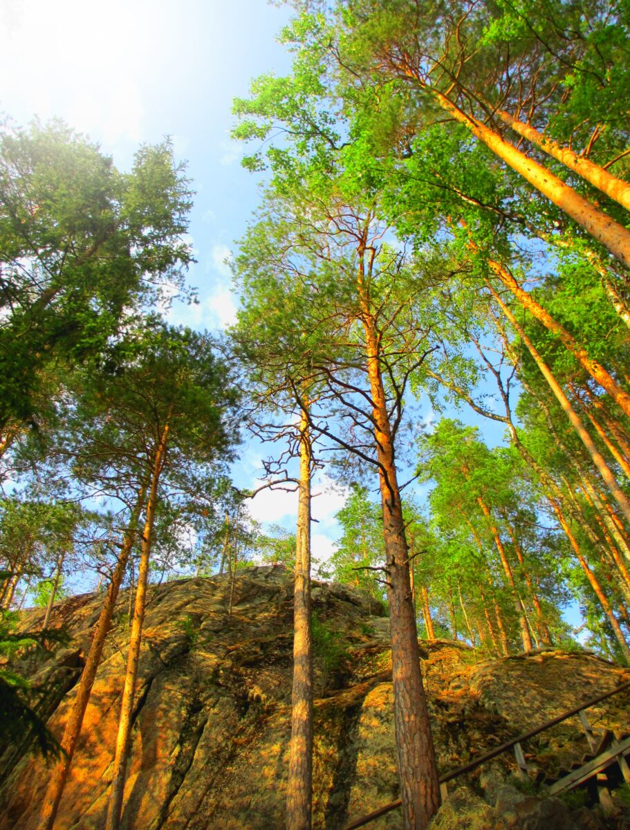 Kuva on otettu Repoveden kansallispuistossa, jossa komeat jylhät puut ympäröi kalloista retkipolkua.
