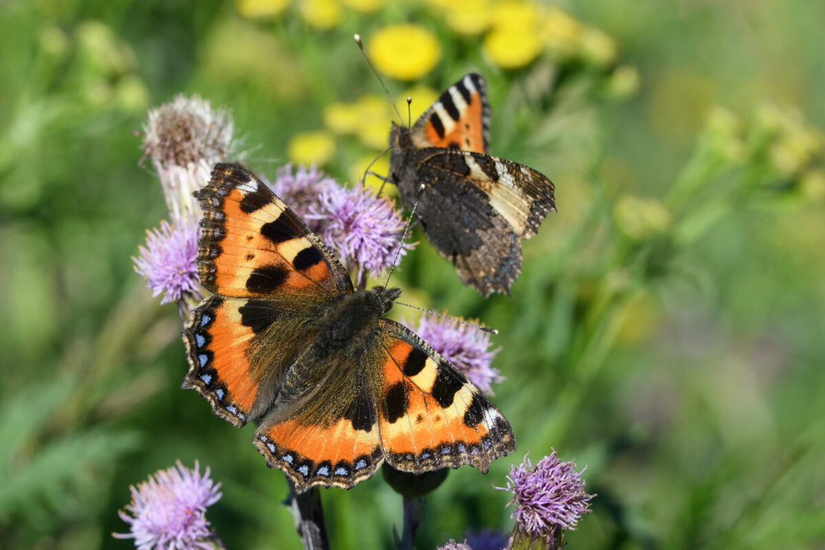 Heinäkuisella niityllä lenteli runsaasti nokkosperhosia (16.7.2020).
