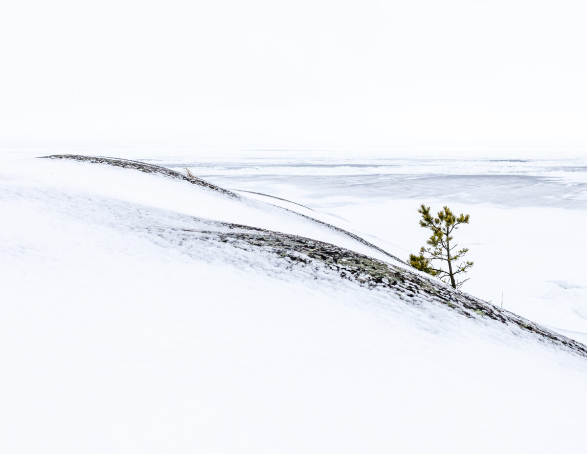 Karu talvi itäisellä Suomenlahdella. Mänty, kuten minäkin, juurtunut maisemaan, jossa ei ole helppoa, mutta jossa on hyvä olla.