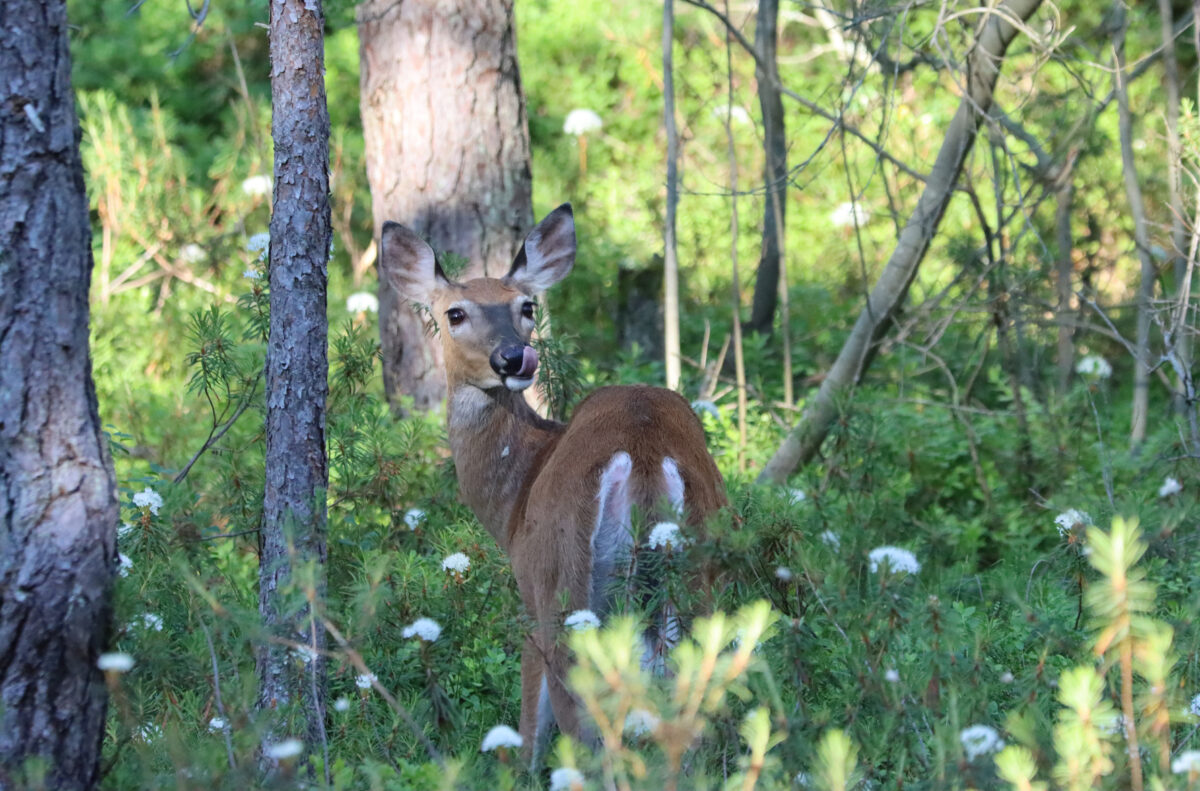 Kuljin metsässä ja yllättäen huomasin ihan lähellä peuran syömässä suopursujen keskellä. Se söi niin keskittyneesti, että ei hetkeen huomannut minua ollenkaan. Kameran räpsähdettyä se vilkaisi ihmetellen taakseen, mutta jatkoi syömistään rauhassa vielä pitkään, vaikka tarkkailin sitä vain reilun kymmenen metrin päästä. Minun luontoni on täynnä ihania, yllättäviä kohtaamisia ja luottamuksen osoituksia.