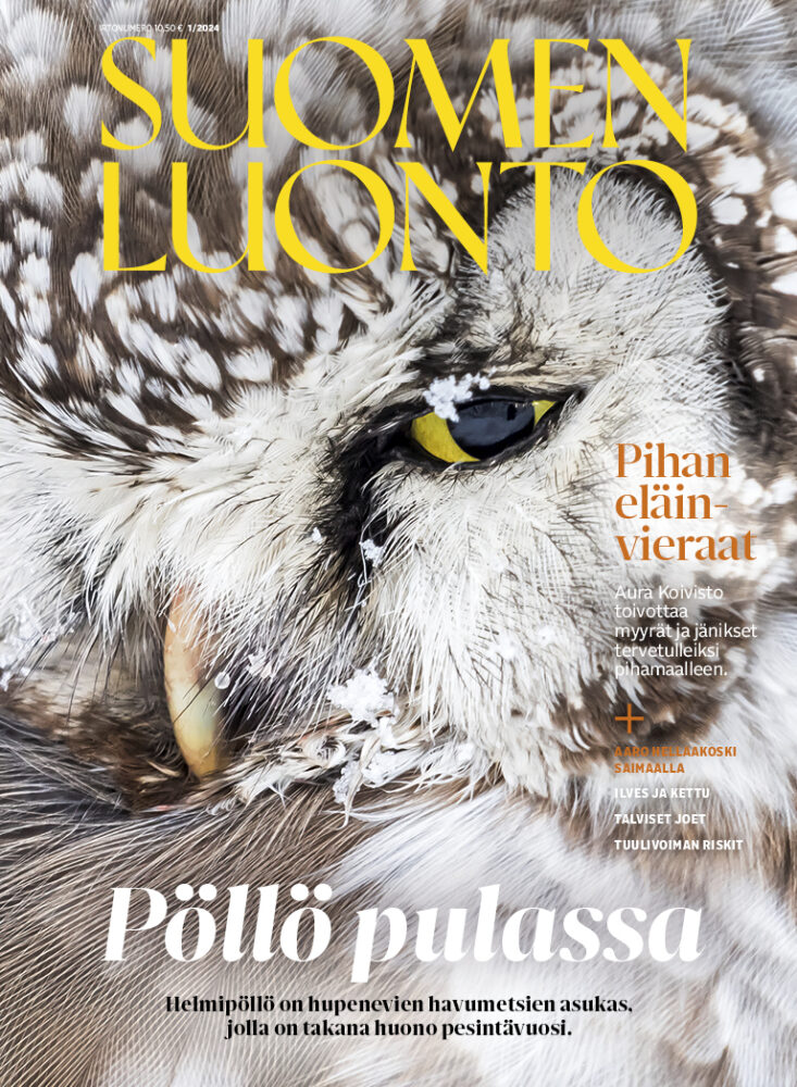 Ilmestyy 18.1.2024 Vuoden ensimmäisessä numerossa päivitämme helmipöllön kuulumisia ja tutkimme elämää virtavesissä ja sisälle tulevia hyönteisiä. Vierailemme Puumalan Rokansaarella Aaro Hellaakosken jalanjäljissä ja Kaarinan Ryövärinluolassa hämähäkkien seurassa. Selvitämme, mitä tapahtuu ketun ja ilveksen kilpaillessa, toivotamme luonnon tervetulleeksi pihaan ja puutarhaan ja kerromme tuulivoimarakentamisen luontoselvitysten puutteista.