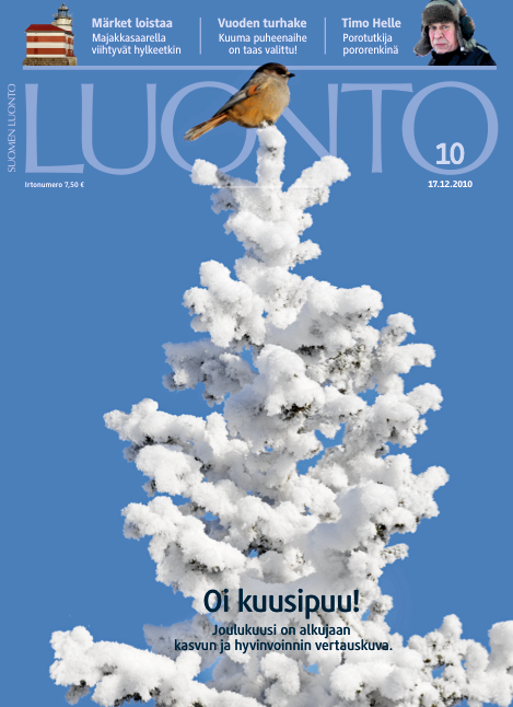 Korvatunturin ja muun Lapin lintu kuukkeli on kuin tähti joulukuusen latvassa. Kuva Markus Varesvuo. Vuoden turhake 2010 on turkis.
