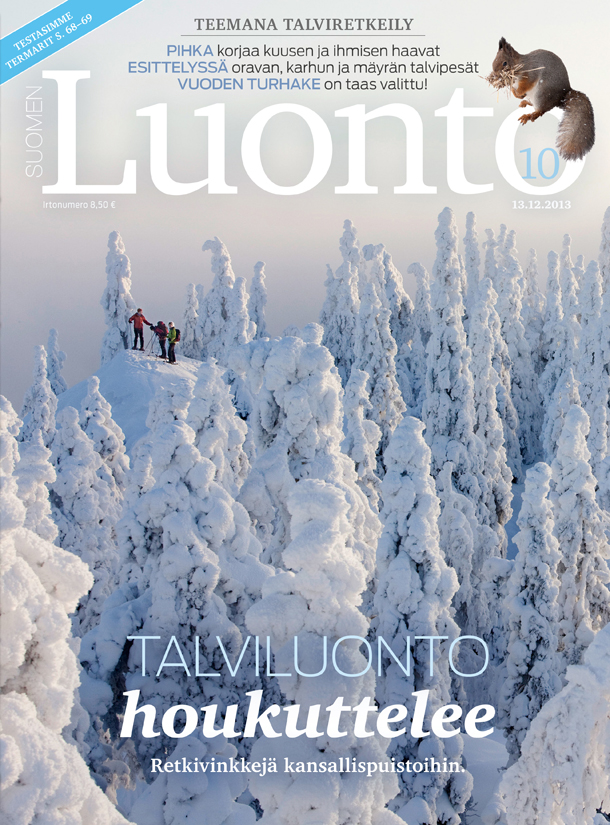 Ilmestyi 13.12. Pahakolille lumikengillä kiivenneet retkeilijät kuvasi Tea Karvinen. Hengästyttäviä talviretkikohteita lehden sivuilla 16-25.