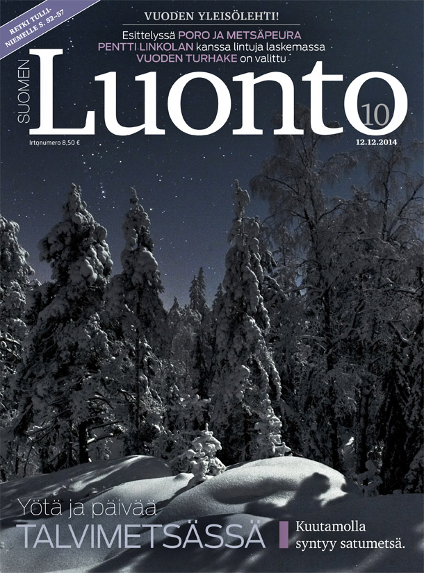 Kuun valo leikkii talvimetsässä. Heikki Willamon tunnelmia yön ja päivän metsästä sekä sen elämästä lehden sivuilla 36–43.