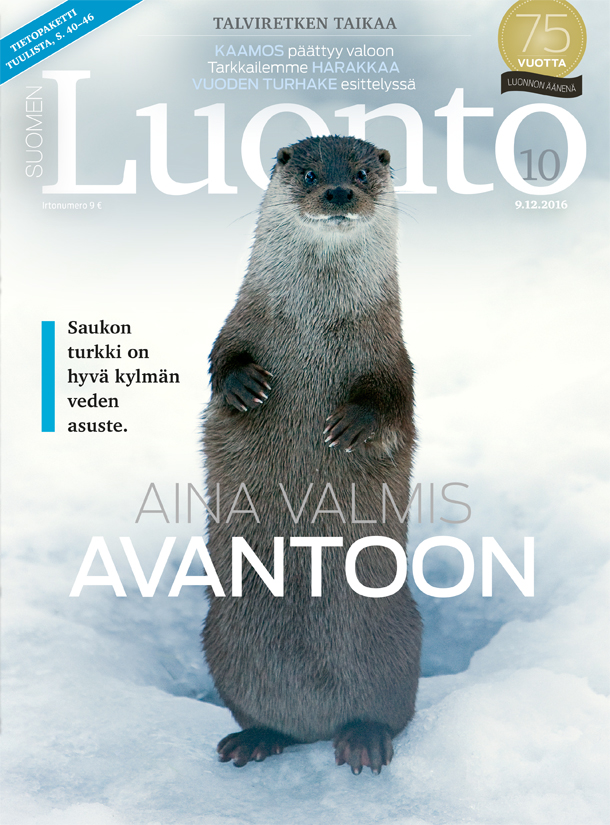 ilmestyy 9.12. Viime rauhoituksen 1974 jälkeen saukkokanta on elpynyt ja talvisin saukkoja voi nähdä monien vesistöjen sulissa. Kannen saukon kuvasi tarhaoloissa Jari Peltomäki.
