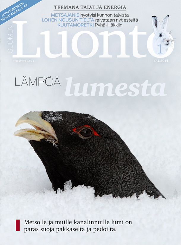 Ilmestyi 17.1. Metso suojautuu kiepissä pakkaselta muiden metsäkanalintujen tapaan. Ukkometson kuvasi Jari Peltomäki. Aiheesta lehden sivuilla 32–39.