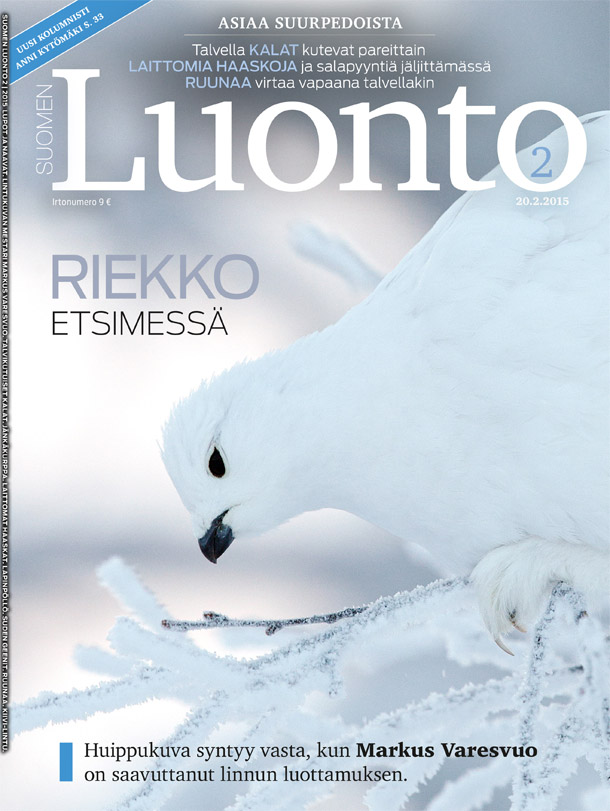 Riekon kuvaaminen edellytti Markus Varesvuolta tuntien odottelua tunturissa. Peräänantamaton kuvaaja esitellään sivuilla 16–25.