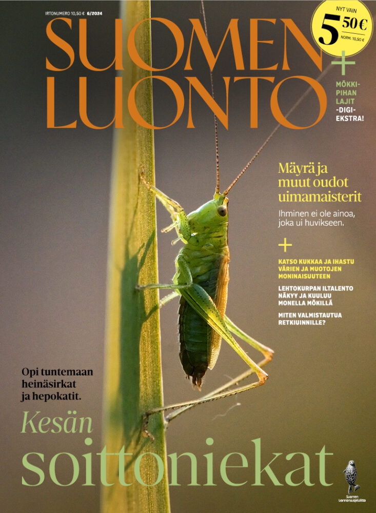 Nyt on kesäinen luonto runsaimmillaan! Tässä numerossa lähdemme luonnonvesiin retkiuinnille ja tapaamme vesillä myös mäyrän, siilin ja muita yllättäviä uimamaistereita. Opimme tuntemaan hepokatit ja heinäsirkat ja tutkimme kukkien kiehtovaa rakennetta. Selvitämme, miksi toukohärkä pyrkii erakkomehiläisen kyytiin ja tutkimme äänekkäillä lentokierroksillaan huomiota herättävän lehtokurpan tapoja. Lähdemme suurennuslasin kanssa mikroskooppiselle tutkimusretkelle kotipihan nurmelle ja lopuksi tapaamme taidekartanoa pyörittävän biologi Merja Markkulan.