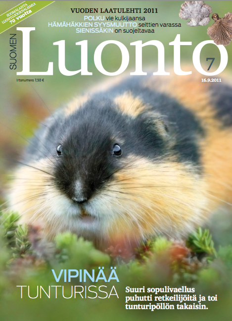 Muita aiheita alkusyksyn numerossa mm. mesisienet, hämähäkit muuttavat, ruokkien rengastus, polut, kyyn kuviot, uhanalaiset sienet, vapaaehtoistyö, Lapin kaunein kylä sekä paljon muuta ajankohtaista ja innostavaa luonto- ja ympäristöasiaa.