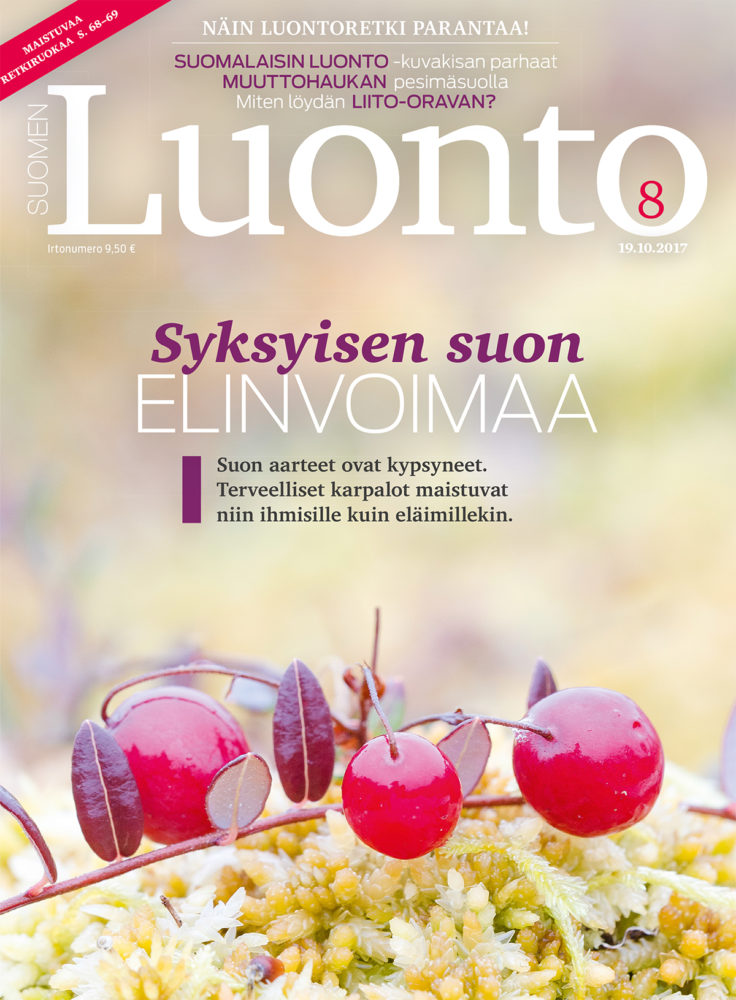 Karpalosuolla käynti kannattaa aina, mekin käymme marjassa lehden sivuilla 30–33. Tässä lehdessä mm. tutustumme muuttohaukkaan ja piekanaan, etsimme liito-oravaa, käymme Kinahmissa, Uutelassa ja suolla, löydämme syksyn viimeiset hyönteiset, julkaisemme luontokuvakilpailun tulokset, käymme parantavalla metsäretkellä ja pohdimme tulevaisuuden ruokaa.