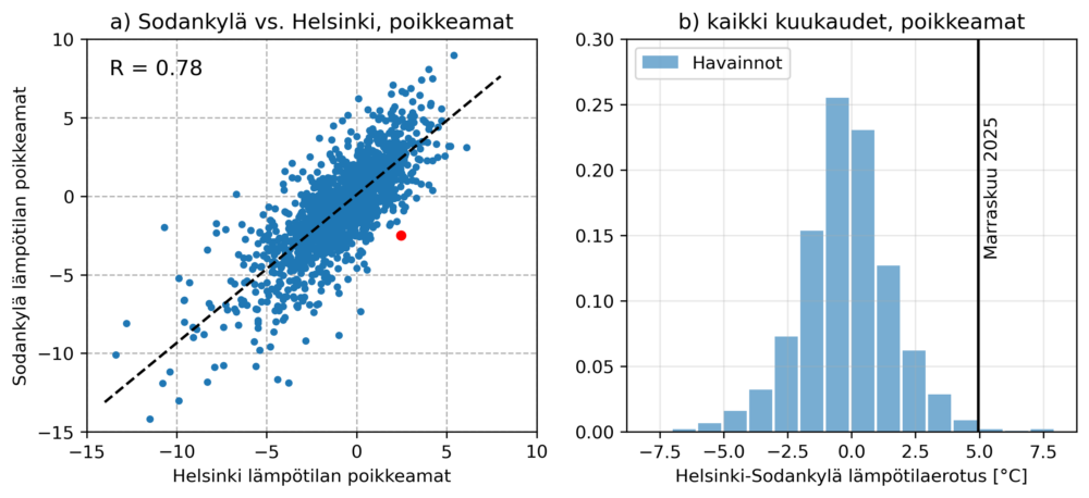 Kuva 2. a) Helsingin Kaisaniemen ja Sodankylän Tähtelän kuukausikeskilämpötilojen poikkeamat. Siniset pisteet kuvaavat kaikkia kalenterikuukausia, ja punainen piste marraskuuta 2025. Katkoviiva on aineistoon sovitettu lineaarinen regressioviiva. b) jakauma kaikkien kuukausien poikkeamien erotuksesta. Poikkeamat ovat laskettu vuosien 1991–2020 keskiarvoihin nähden.