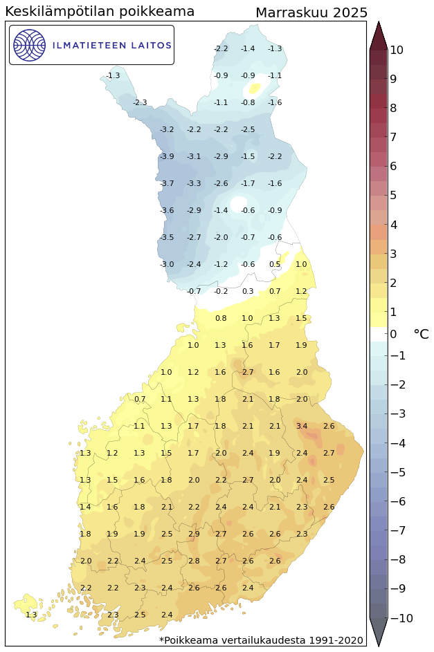 Huomionarvoista on, että vaikka absoluuttinen lämpötilaero oli 13,2 astetta, poikkeamien erotus oli pienempi, sillä Sodankylä on luonnostaan kylmempi paikka. Marraskuussa 2025 poikkeamien ero oli 5,0 astetta, mikä on harvinaista saman kuukauden keskiarvojen välillä.