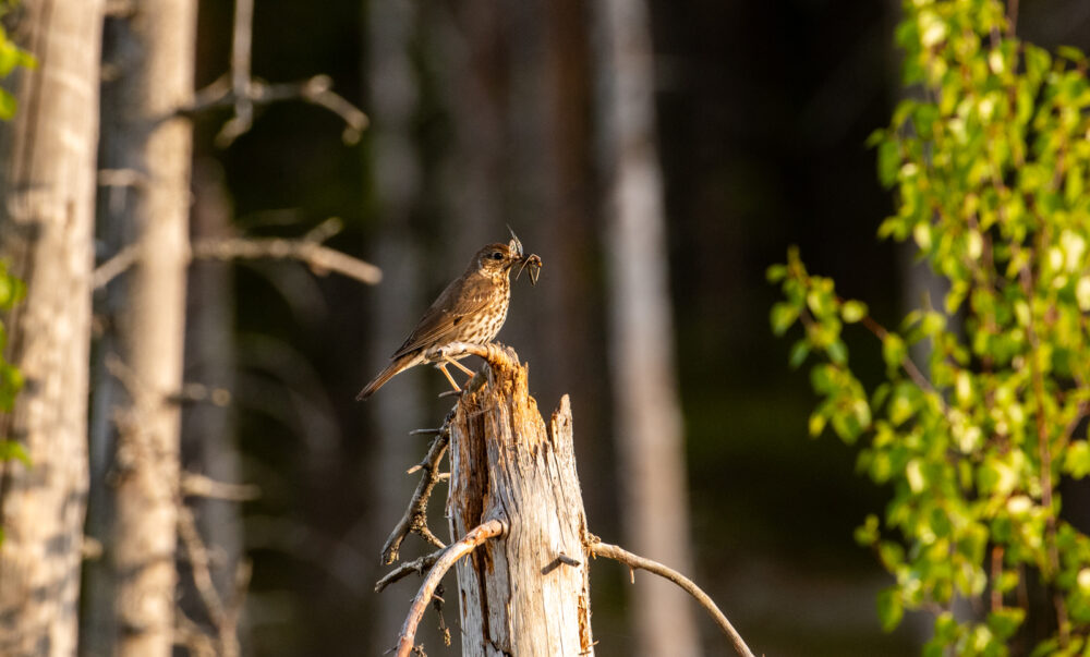 Laulurastas viemässä harvinaisen korentosaaliin pesälleen