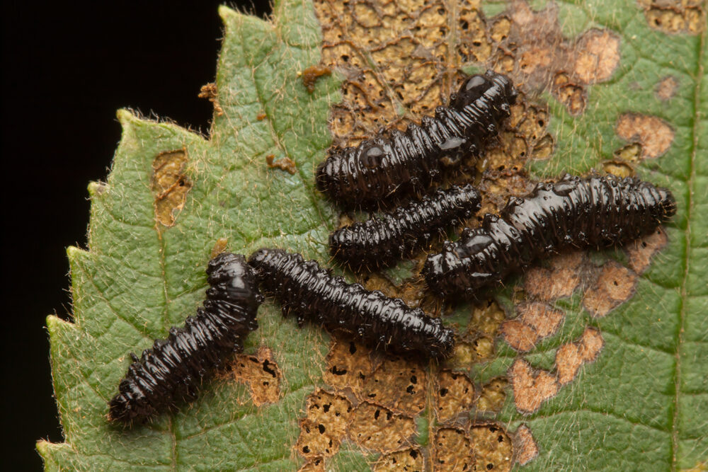 Idänlehtikuoriaisten toukat ovat mustia pötkylöitä, joiden ulkonäkö voi toimia suojavärityksenä ja muistuttaa linnun ulostetta.