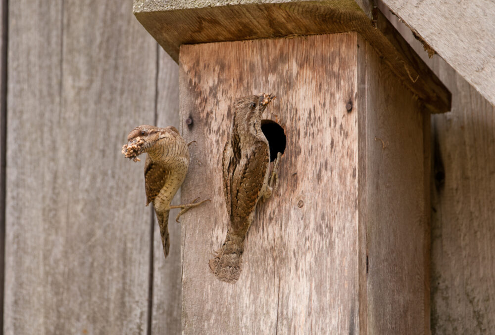 Käenpiikavanhemmat tuovat poikasille muurahaisenmunia. Pönttö on saunarakennuksen seinässä. Kuvat: Samuli Haapasalo