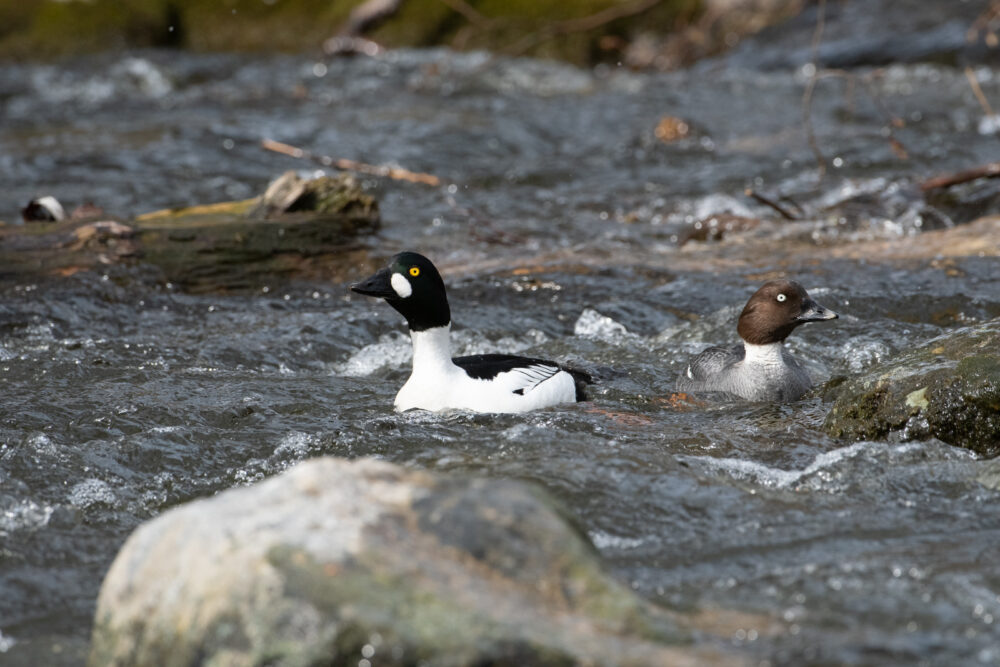 Kalevalan sotka eli telkkä, valkeaposkinen koiras, ruskeapäinen ja pienempi naaras