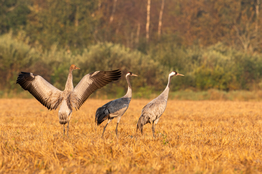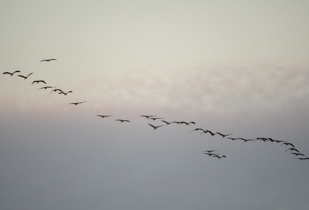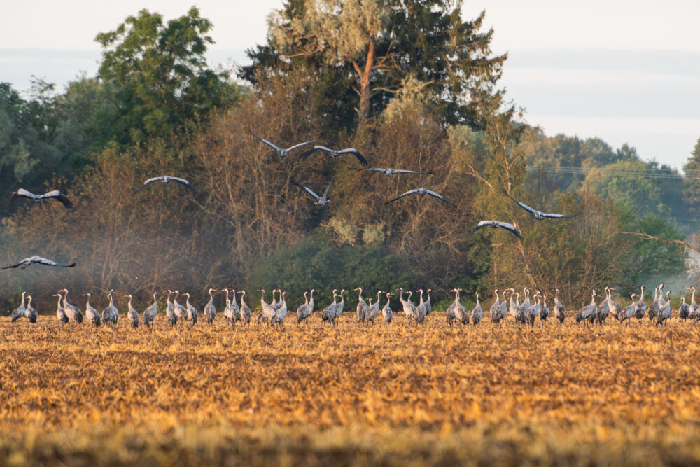 Kurkiperhe liittyy syksyllä isompiin kurkiparviin. Poikanen seuraa vanhempiaan