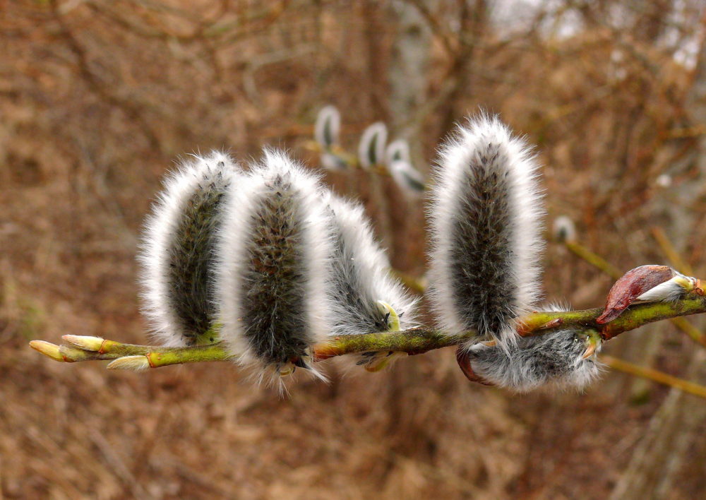 Koiraspuolisen pajun kukinnoista työntyvät esiin pitkät palhot, joiden päässä ovat ponnet.  Kuva: Arja Valtonen / Havaintokirja