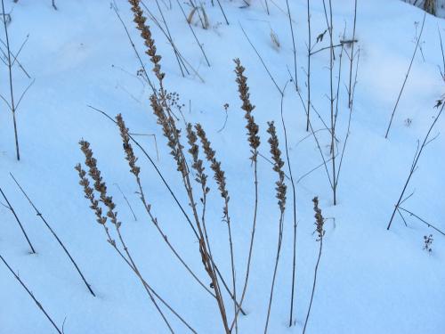 Hangen päälle kurkottavia kuihtuneita kasveja moititaan kesäisin rikkaruohoiksi, mutta talvisin ne ovat ruoka-aittoja.