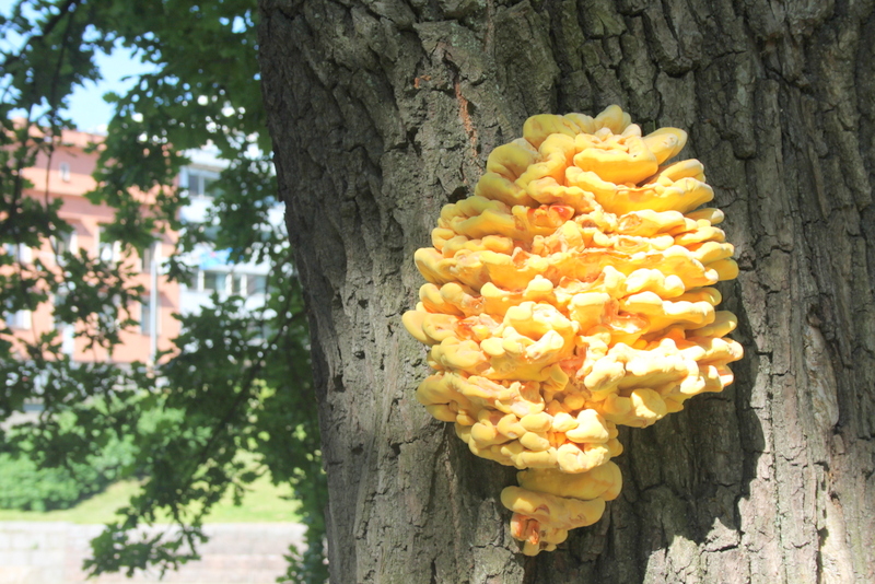 Porvoon Kråkössä kasvaa kahden lähekkäisen tammen kyljessä kookkaita keltaisia sieniä. Sienet huomattiin kesäkuussa, ja ne olivat hyvännäköisinä paikoillaan puiden kyljissä vielä heinäkuussa. Elokuussa sieni oli lakastunut ja pudonnut tai revitty pois puun kyljestä. Mikä on tämä sieni ja onko tavallista, että se kasvaa näin isoksi?