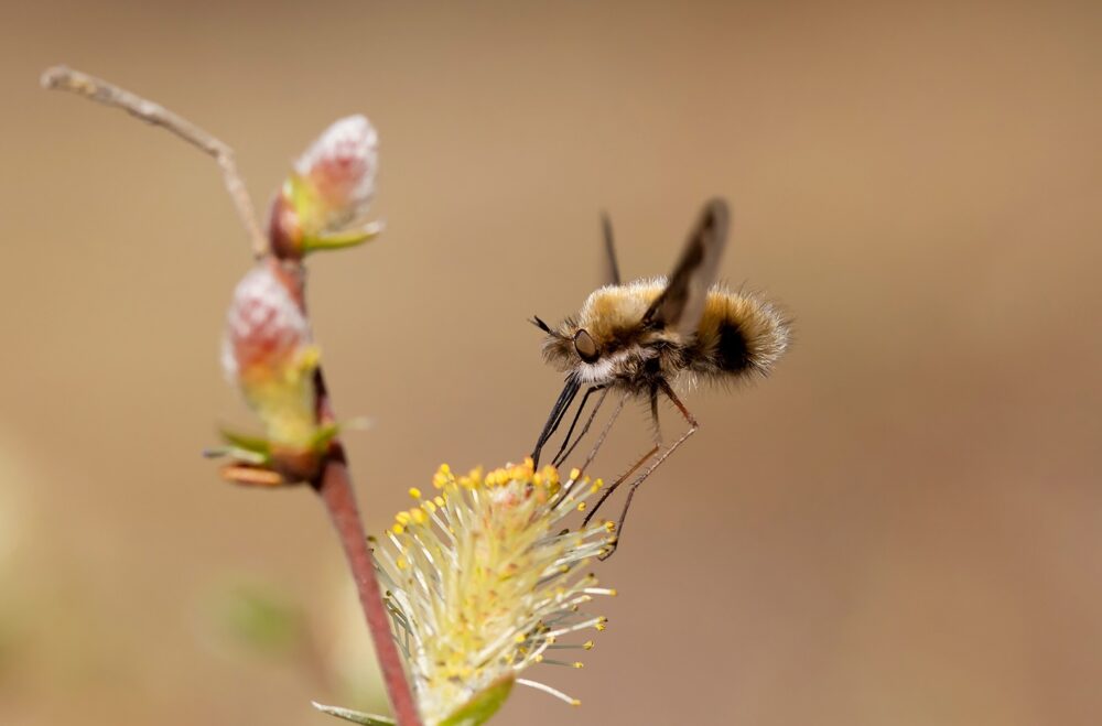 Kevään varhaisimmista kukista saattaa äkätä pörröisen otuksen, joka muistuttaa kimalaista, mutta tarkemmin katsottuna onkin kärpänen.
