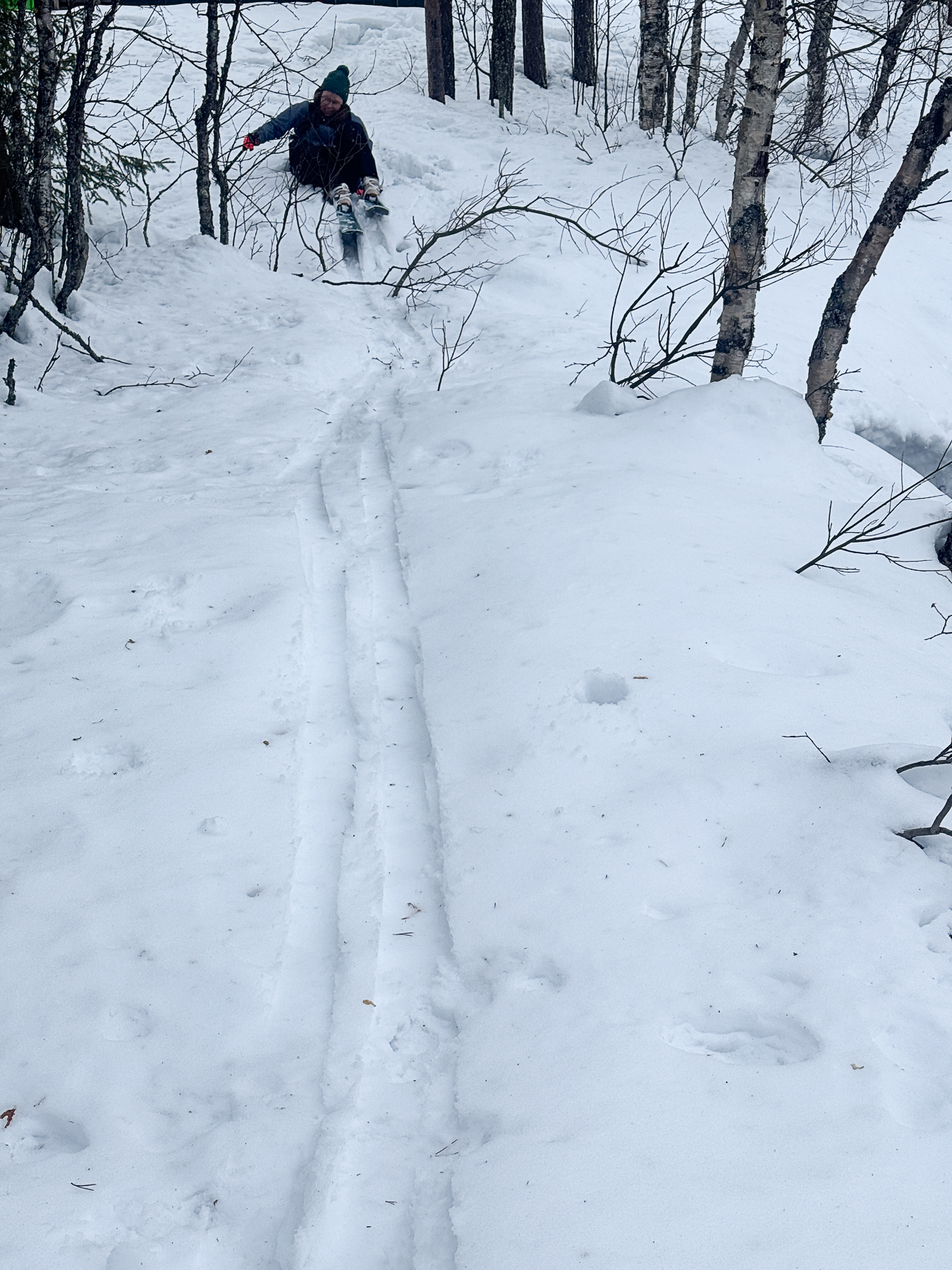 Seurailemme hiihtolatua pienen matkan rannasta eteenpäin, kunnes päätämme suunnata tien yli puiden lomaan jokivarteen. Vänttinen liukuu sulavasti pientareelta metsikköön, ja seuraan perässä samoin elkein. Sukseni kärki haukkaa lunta, horjahdan ja tuiskahdan pyllylleni.