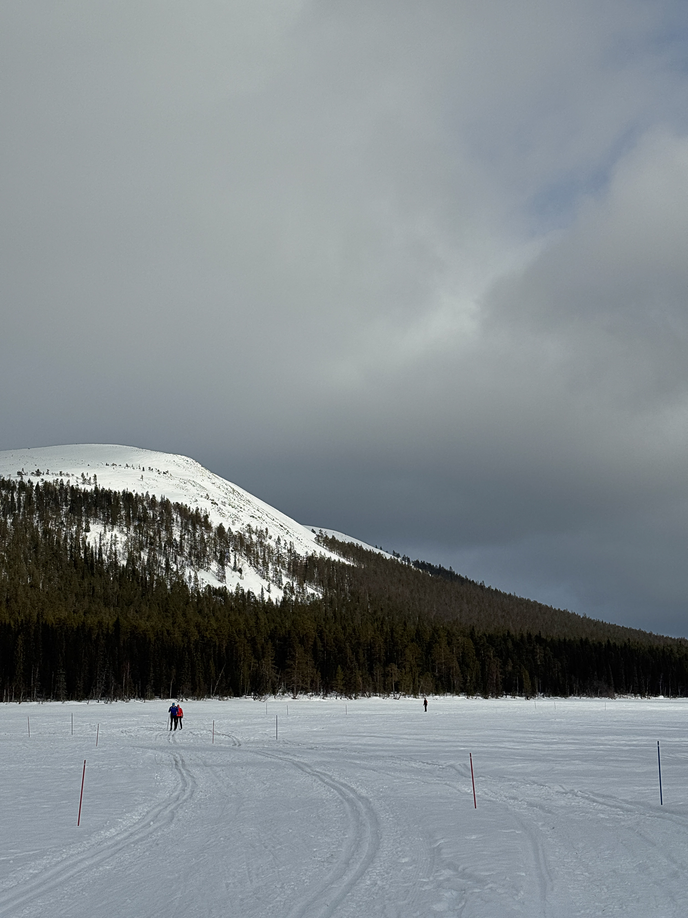Ohi hiihtävät ihmiset hidastavat ja jäävät juttusille. Mitkä nuo ovat? Voiko niillä laskea telemarkia? Muistelen, mitä Ihamuotilalta juuri opin, ja kertaan tietojani suomeksi ja englanniksi ihmettelijöille. Ihamuotila kertoi, että liukulumikengillä on sallittua kulkea luisteluhiihtoreittejä pitkin, eikä kukaan myöskään vaikuta närkästyvän, vaikka sivakoimme ladulla.
