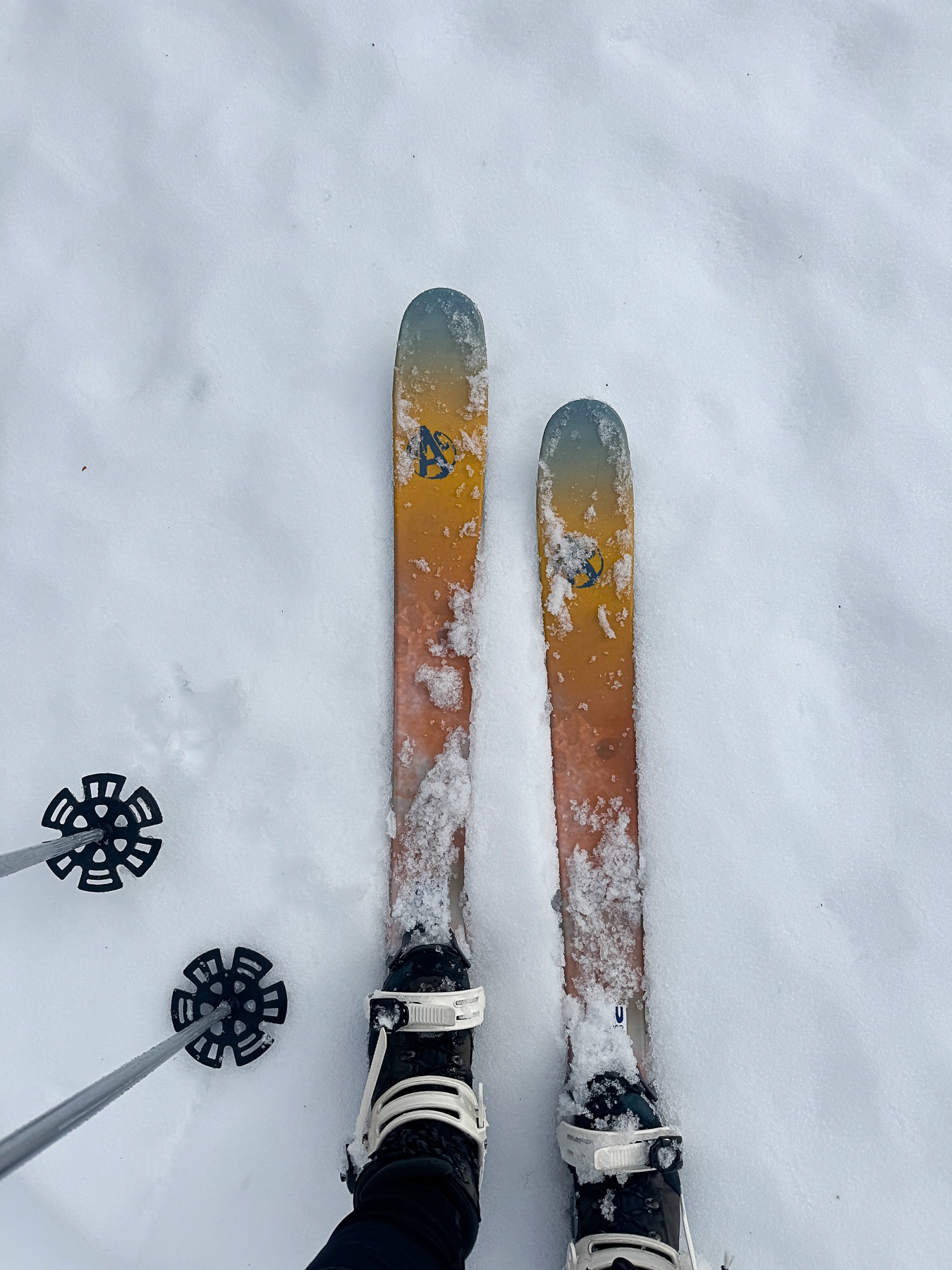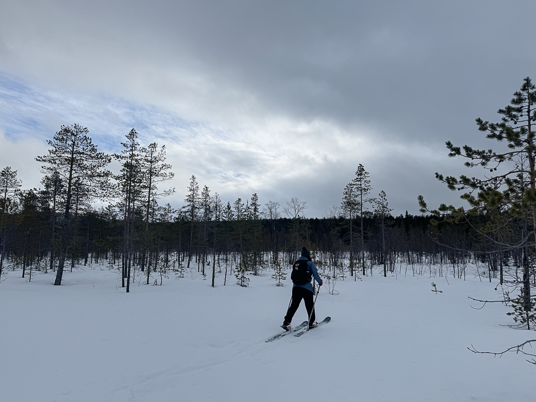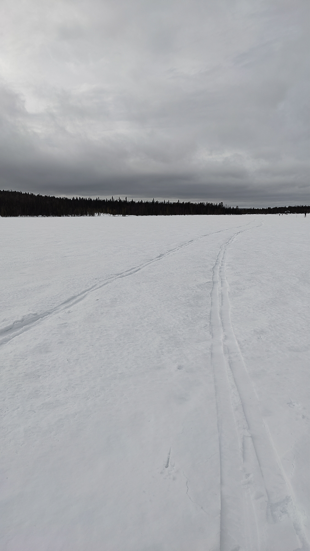 Nousemme pois huolletulta ladulta hangen päälle, ja suksi alkaa kulkea nenän osoittamaan suuntaan. Matkalla järven poikki huomaamme, miten hankalaa lunta on lukea. Välillä hanki kantaa ja suksi liukuu hyvin, välillä pinta muuttuu yllättäen pehmeäksi.