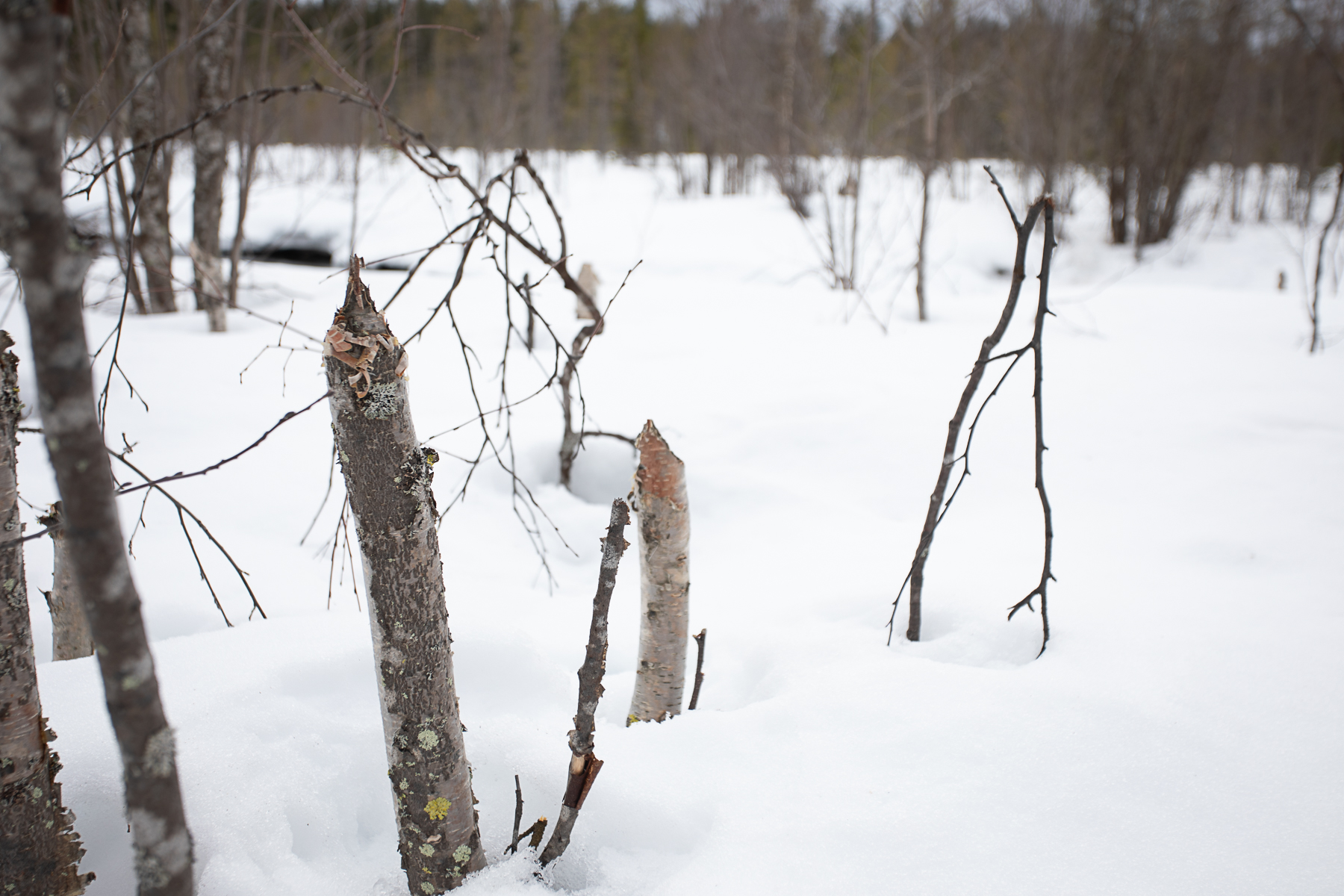 Palaamme jälleen hangelle puustoisen rämeen kohdalla ja sujuttelemme jokivarteen. Huomaan katkotut koivut samalla hetkellä kun Vänttinen osoittaa vastarannalle: majavan kulkureitti! Lumeen on tamppaantunut joesta nouseva polku. Umpihanki on niillekin varmasti hankala.