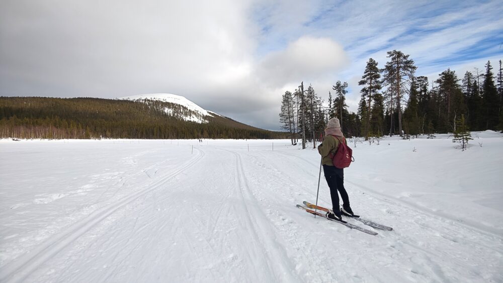 Ohi hiihtävät ihmiset hidastavat ja jäävät juttusille. Mitkä nuo ovat? Voiko niillä laskea telemarkia? Muistelen, mitä Ihamuotilalta juuri opin, ja kertaan tietojani suomeksi ja englanniksi ihmettelijöille. Ihamuotila kertoi, että liukulumikengillä on sallittua kulkea luisteluhiihtoreittejä pitkin, eikä kukaan myöskään vaikuta närkästyvän, vaikka sivakoimme ladulla.