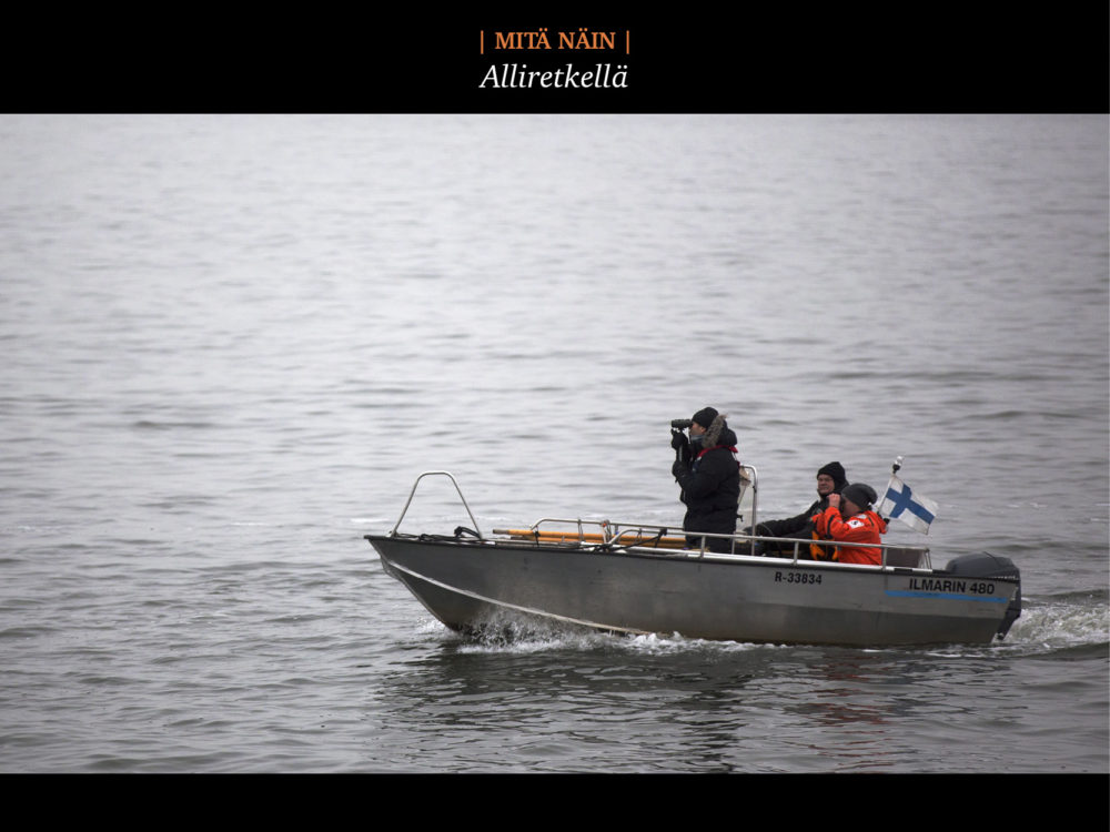 6. Talvinen päivä on lyhyt ja valoa on vähän. Joulukuinen meri on tällä kertaa harvinaisen tyyni, tuulta on vain muutama metri sekunnissa. Viisi tuntia kestävän retken loppupuolella tuuli tyyntyy lähes kokonaan. Jarmo Nieminen kertoo, mitä luotoja horisontissa näkyy.