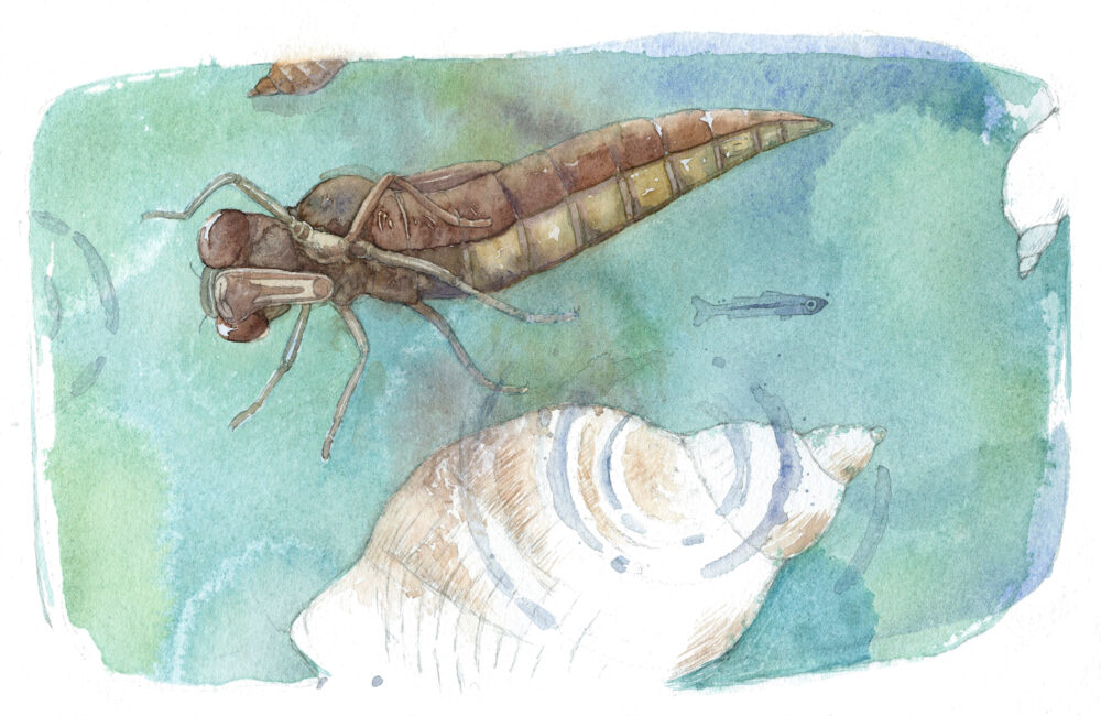 Elämä pinnan alla muuttuu kesän edetessä. Vesikasveihin ilmestyy munaryhmiä, toukat kiipeävät pintaan ja saavat siivet selkäänsä.