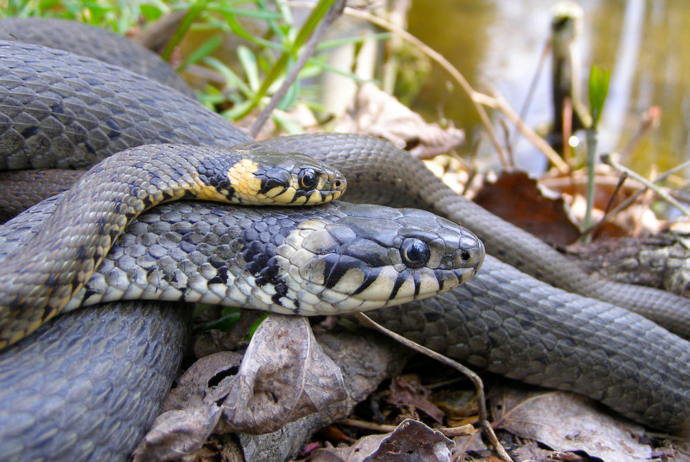 Rantakäärmeen niskatäplät ovat tavallisesti valkoiset, keltaiset tai oranssit. Kuva: Mircea Nita / Flickr (CC BY 2.0)