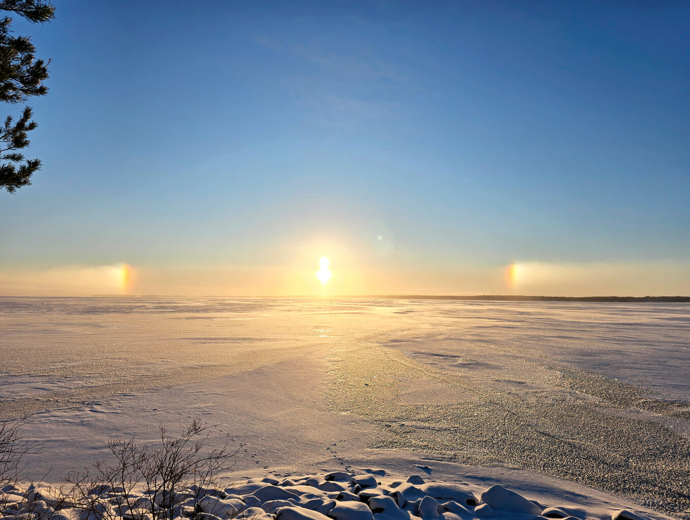 Joulukuun viimeisenä päivänä oli hiljaista luonnossa, mutta taivaalla oli hetken kauniit halot auringon molemmilla puolilla. Kuva: Jaana Saarelainen, Joensuu 31.12.2025.