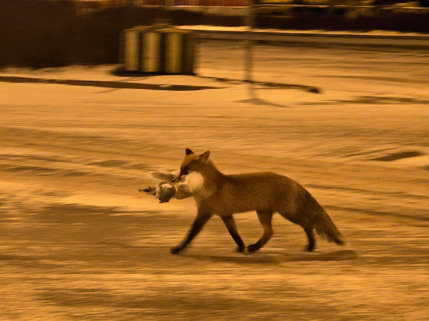 Kettu käveli ohi lokki suussaan Turun satamassa. Kuva: Frida Suomalainen, Turku 30.12.2025.