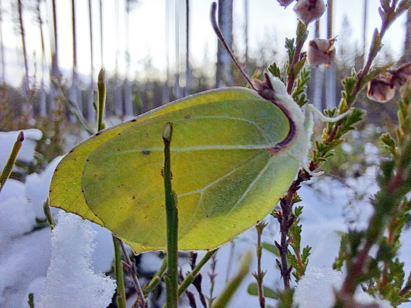 Jo lokakuussa näin samoilla paikoilla talvehtivan sitruunaperhosen. Sitten sää taas lämpeni ja perhonen katosi. Tapaninpäivänä löysin kaverin uudelleen. Tässä perhonen kuvattuna Hannes-myrskyn jälkeisenä aamuna. Kuva: Kaisa Marila, Sumiainen 28.12.2025
