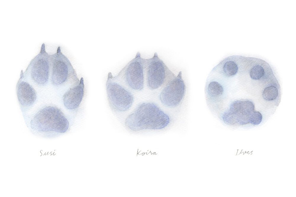 Suden, koiran ja ilveksen jäljet voivat usein näyttää hyvin samankaltaisilta. Kuvitus: Juha Ilkka