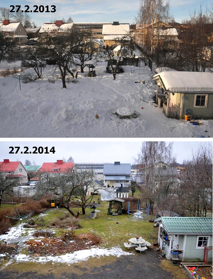 Seurasin viime vuonna Kevät saapuu -blogissani kevään tuloa Hämeeseen pihallani. Onneksi tein sen viime vuonna! Nyt kevään saapumisessa ei olisi mitään katsottavaa. Oheisesta kuvaparista voi todeta tilanteen. Jos sattuu olemaan talvenystävä, kuten itse olen, voi kaihoillen todeta, kuinka upea ja runsasluminen viime vuoden talvi oli.