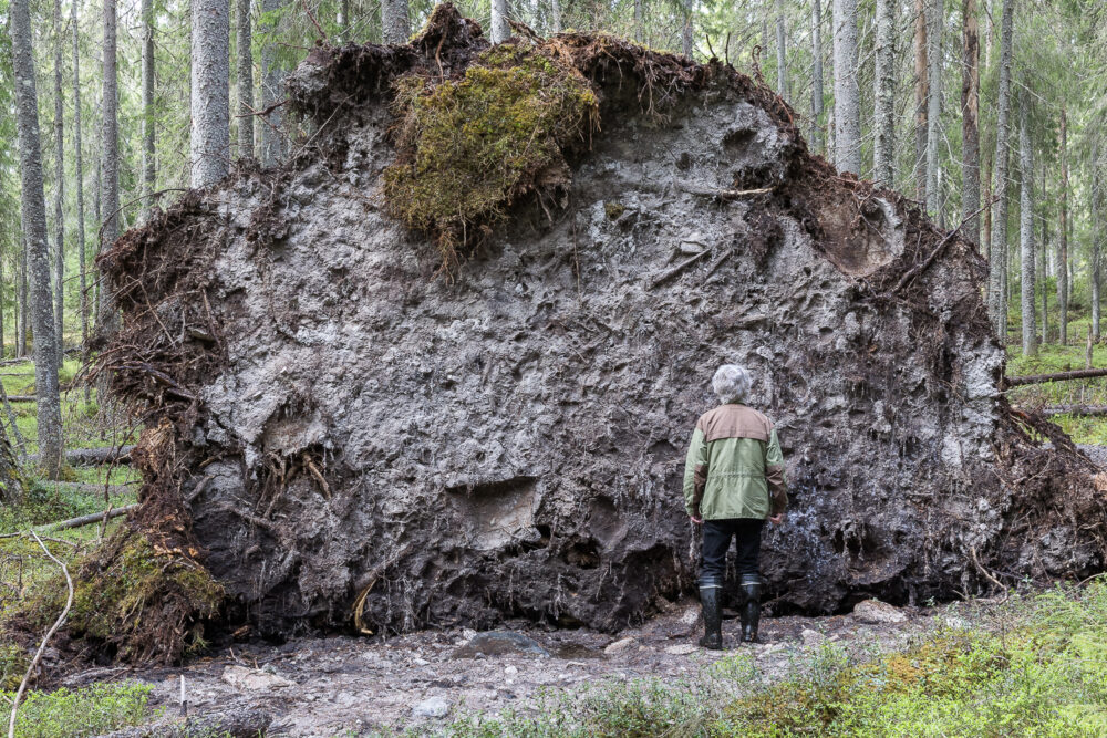Kaatuneen kuusen muhkea juurakko.
