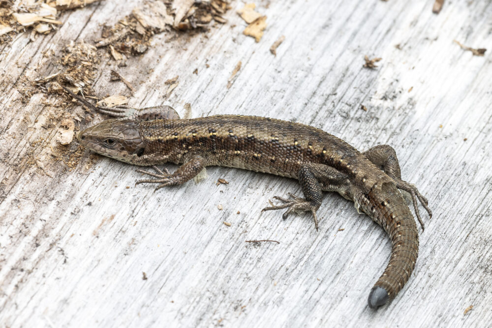 Kesän lämpö on saanut sisiliskon liikkeelle. Lisko on ilmeisesti aiemmin joutunut pinteeseen ja saalistajaa paetakseen katkaissut häntänsä.