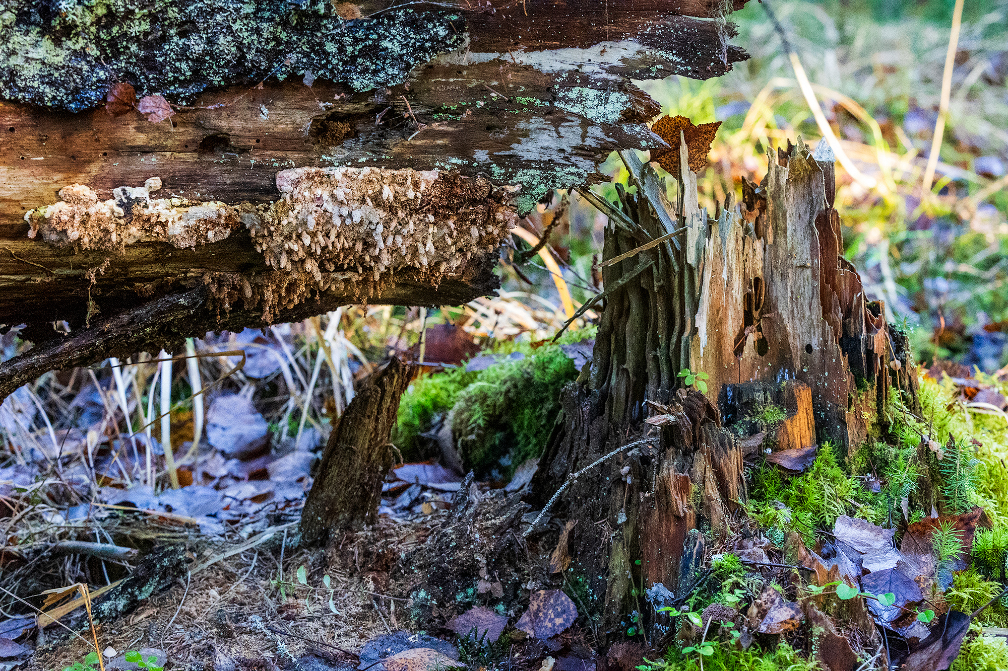 Kaatuneen kuusen runkoa lahottavat rivikääpä ja ruostekääpä. Rivikääpä on päätynyt hyönteisten ravinnoksi.